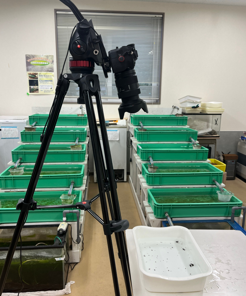 撮影は、ホタルの幼虫とカワニナを適切な環境で共存させることから始まりました。五天山公園内の環境学習館に水槽を設置し、幼虫とカワニナが自由に行動できる状態に投入します。そこから幼虫がどのサイズのカワニナを捕食するのか、また、どのようにして捕食するのかを明確に記録するためには、カメラの配置や撮影方法を慎重に考えなければなりません。